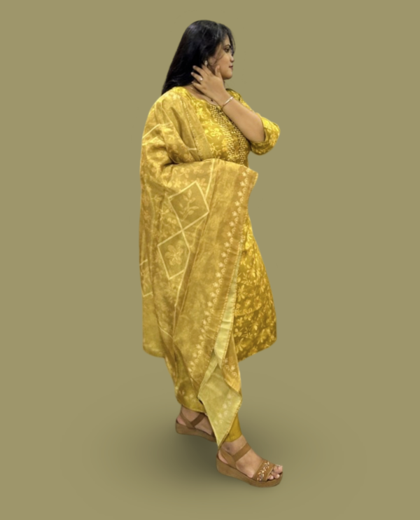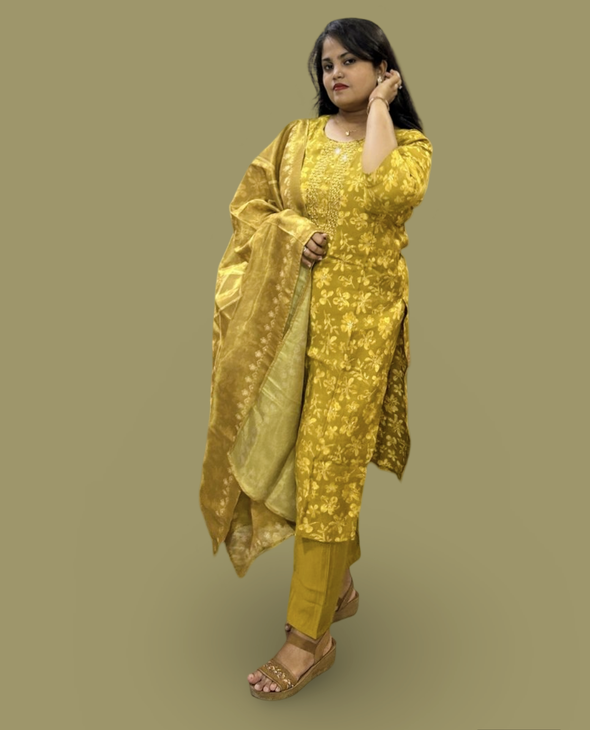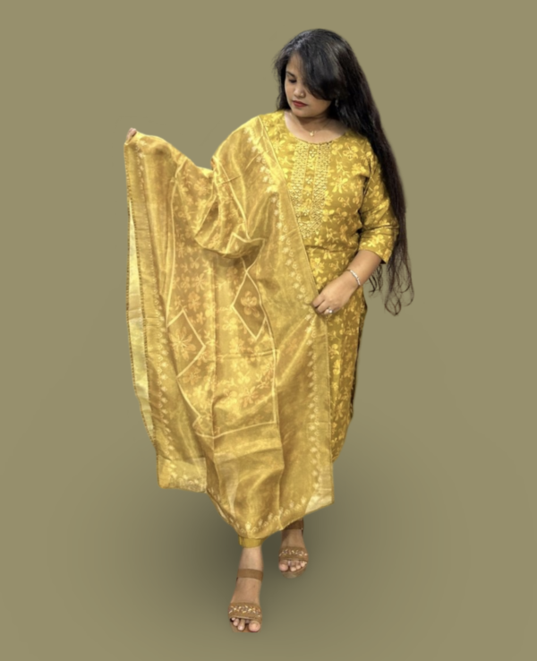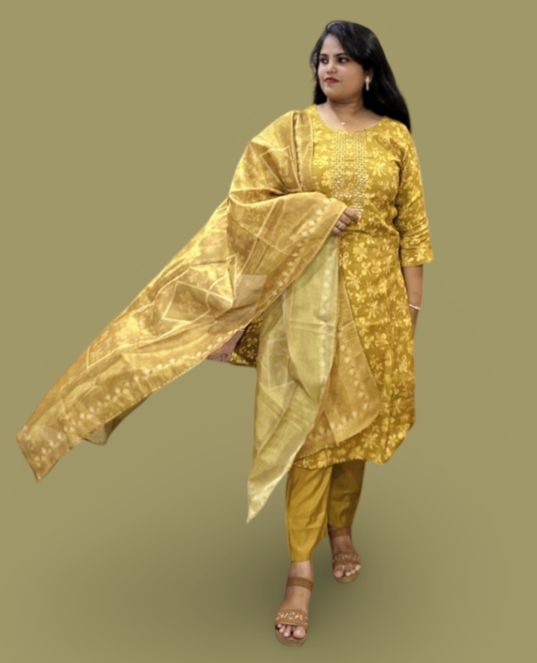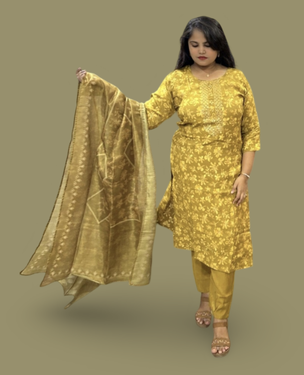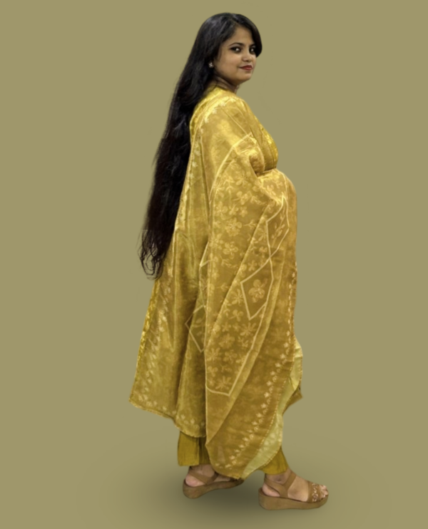 Elevate your ethnic wardrobe with this stunning mustard gold shimmer kurta set. Designed for a regal look, this ensemble features intricate floral embroidery and mirror work on a luxurious shimmer fabric, making you shine at every celebration. Paired with a solid pant and a designer woven dupatta, this outfit is perfect for festive occasions, weddings, and special events.